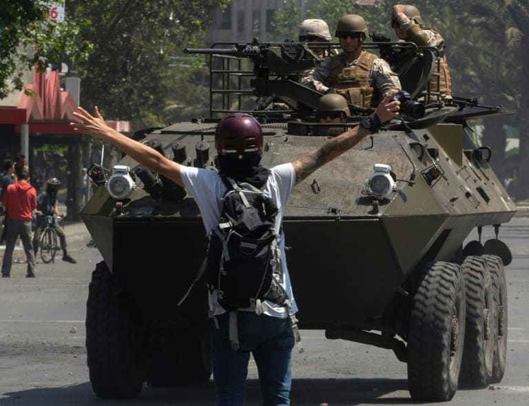 INICIO / (Desde AFP y otras Agencias): Siete muertos en una nueva jornada de protestas y saqueos en Chile (+Video y Tweets) / Manifestantes se enfrentan a efectivos militares durante protestas en Santiago de Chile 20 10 19 Foto Claudio Reyes AFP