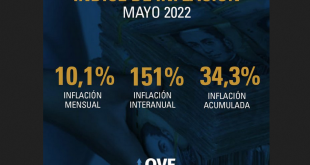 El Observatorio Venezolano de Finanzas (OVF) informó que la inflación de mayo se ubicó en 10,1% -por encima de la tasa de abril que fue de 3,6%- mientras que la interanual se situó en 151% y la acumulada en 34,3%. El economista y y miembro del OVF, José Guerra, fue …